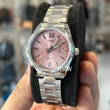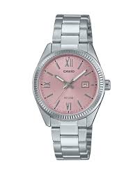 Pink sunray dial with clear silver-tone hands and date display at 3 o’clock
